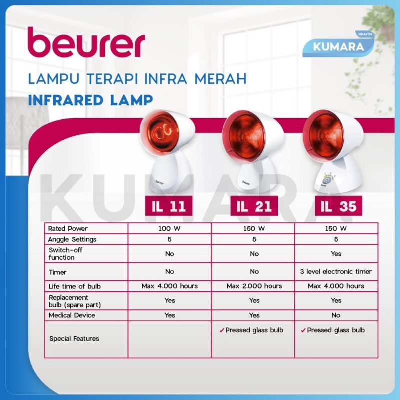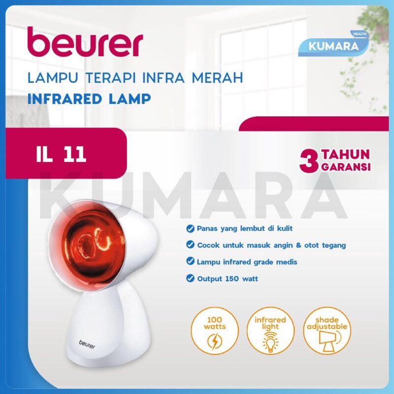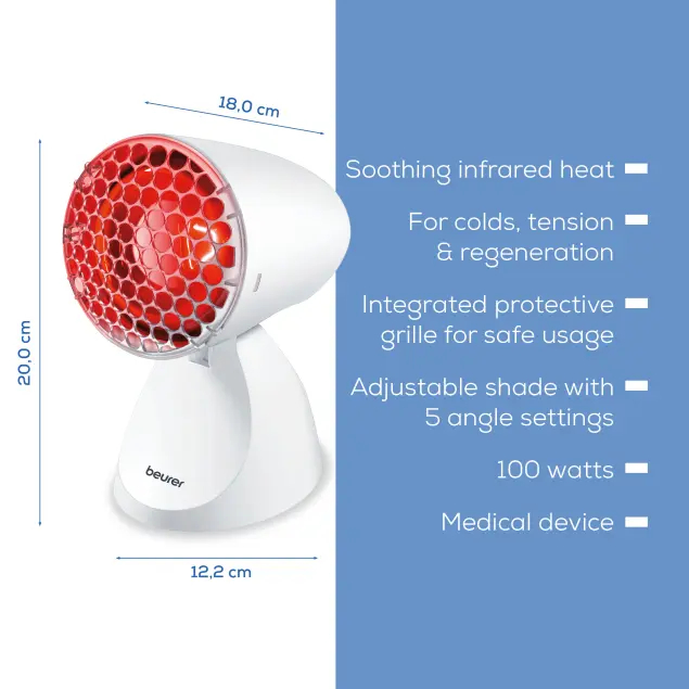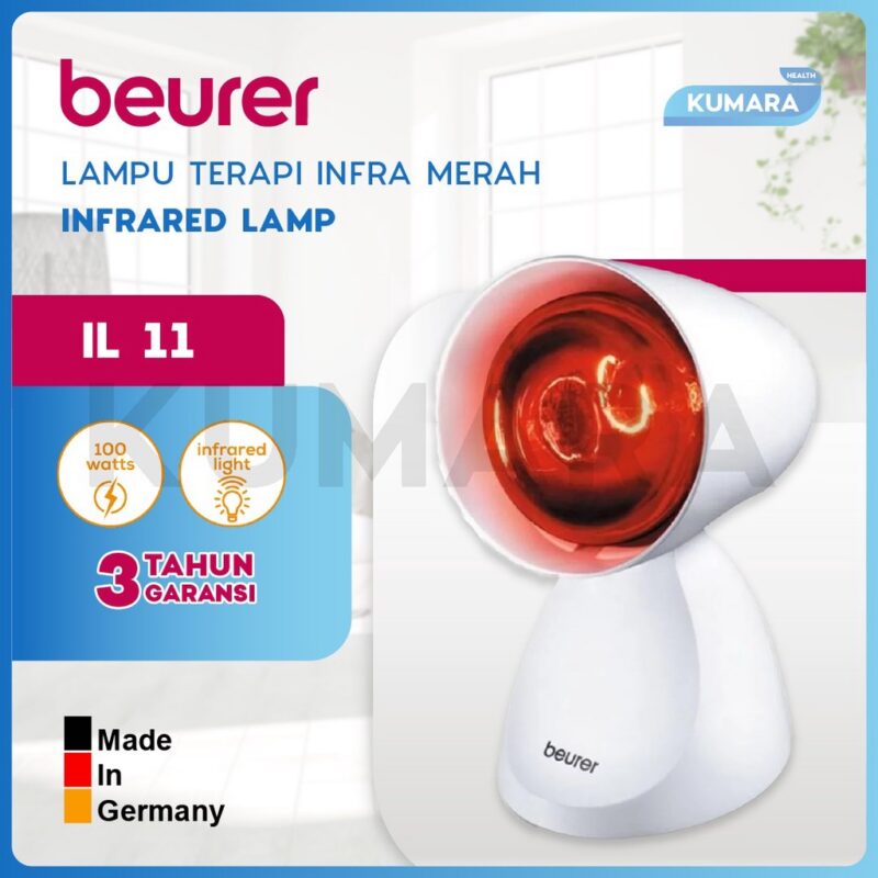 Suhu yang hangat dari lampu inframerah Beurer bisa digunakan untuk mencegah dan meredakan rasa tidak nyaman. IL 11 memiliki daya sekitar 100 watt dan cocok untuk digunakan saat flu, ketegangan, atau nyeri otot. Pelindung lampu dapat diatur ke 5 posisi berbeda untuk aplikasi yang individual dan fleksibel.
