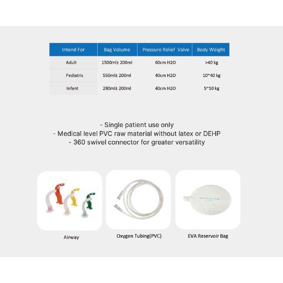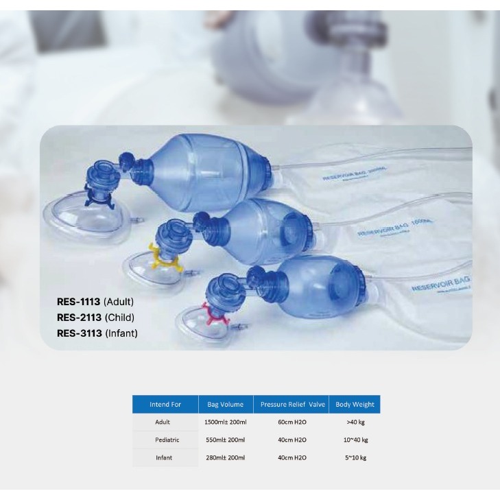 AMBUBAG MANUAL PVC RESUSCITATOR GEA Tersedia ukuran Bayi (RES-3113) Anak (RES-2113) Dewasa (RES-1113) Include – Guedel airway – Oxygen tubing (PVC) – EVA Reservoir bag – Hanya untuk penggunaan satu pasien – Bahan baku PVC tingkat medis tanpa lateks atau DEHP – Konektor putar 360 derajat untuk fleksibilitas yang lebih besar
