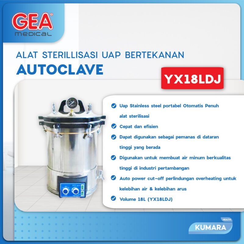 GEA AUTOCLAVE 18 LITER WITH TIMER Merupakan Alat Sterilisasi Portabel Bertekanan Uap di mana produk ini menggunakan uap jenuh untuk mensterilisasikan benda dengan cepat dan efisien. GEA AUTOCLAVE 18 LITER WITH TIMER dapat digunakan di rumah sakit, klinik di pabrik dan tambang, dan lembaga penelitian ilmiah. WAJIB PACKING KAYU, CHECKOUT BARANG + PACKING KAYU Spesifikasi Produk : – Model : YX-18LDJ AutoClave + Timer 18Ltr portable stainless steel – Sterilisasi Volume : 0,018M3 – Tekanan Kerja : 0. 14-0. 16Mpa – Maks. Tekanan Kemanan : 0. 165Mpa – Rentang Pengaturan Tekanan : 0,05-0,14 Mps – Rentang Waktu : 0-60 menit – Daya / Konsumsi : 2KW / AC220V.50Hz – Ukuran Drum : 280 x 260 mm – Dimensi : 41 x 41 x 52 cm – Diameter : 28cm Untuk pengajuan komplain wajib menyertakan video unboxing paket. Semua produk yang telah dibeli tidak dapat di retur, karena resiko kemasan rusak akibat kesalahan kurir pada saat pengiriman paket. Pastikan produk yang dipesan sudah benar dan sesuai pada saat transaksi. Happy Shopping Sahabat Sehat Keluarga !!