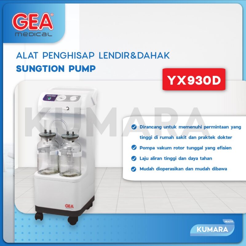 GEA – Electric Suction Pump YX930D | Alat Penghisap Lendir Dahak 2 Botol – Alat Penyedot Dahak Lendir Suction Unit YX930D Gea atau Alat Suction elektrik model YX930D adalah alat hisap sekresi yang sangat kuat, didesain special untuk kebutuhan tinggi dari rumah sakit/praktek dokter. – Alat Penyedot Dahak Lendir Suction Unit YX930D GEA ini memiliki Type mobile dengan 4 roda. Kelebihan Suction elektrik YX930D : -Minyak pompa vacuum rotor tunggal efisien meresapi baling-baling mampu menguras tenaga dan daya tahan tinggi -Suara tidak berisik/bising -Botol Suction dilengkapi sistem cut off untuk aliran yang berlebih -Mencegah cairan yang mengalir dari tabung ke pompa -Kapasitas Volume ideal, dapat diatur dari 0.02-0.09 MPa (150-680mmHg) -Oleh karena pengaturan yang wajar dan ketinggian yang sesuai, memungkinkan operator untuk mengamati dan memeriksa dari segala arah. -Mudah dioperasikan dan mudah dibawa -Ideal untuk kebanyakkan aplikasi rumah sakit Spesifikasi : KEMENKES RI AKL 21603711951 – Nama : Suction YX930D GEA – Merek : GEA – Batas tekanan negative: > 0.09MPa (680mmHg) – Suction rate: >20L/Min (in pump exit: >30L/min) – Daya: AC220V +10%, 50Hz, Input 600VA – Dimensi : 46,5 cm x 42.5 cm x 93,5 cm – Sekring untuk daya RFI '"' 5 x 20/1 AL – Sekering untuk transformator RFI '"' 5 x 20 / 0,5 AL – Max Vacuum ' 680 mmHg – Adjs. Vacuum Rentang 150 mmHg ~ Max. Kekosongan – Kekuatan Suplay ~ 220 V, 50 Hz – Dimensi 41 x 41 x 77 Untuk pengajuan komplain wajib menyertakan video unboxing paket. Semua produk yang telah dibeli tidak dapat di retur, karena resiko kemasan rusak akibat kesalahan kurir pada saat pengiriman paket. Pastikan produk yang dipesan sudah benar dan sesuai pada saat transaksi. Happy Shopping Sahabat Sehat Keluarga !!
