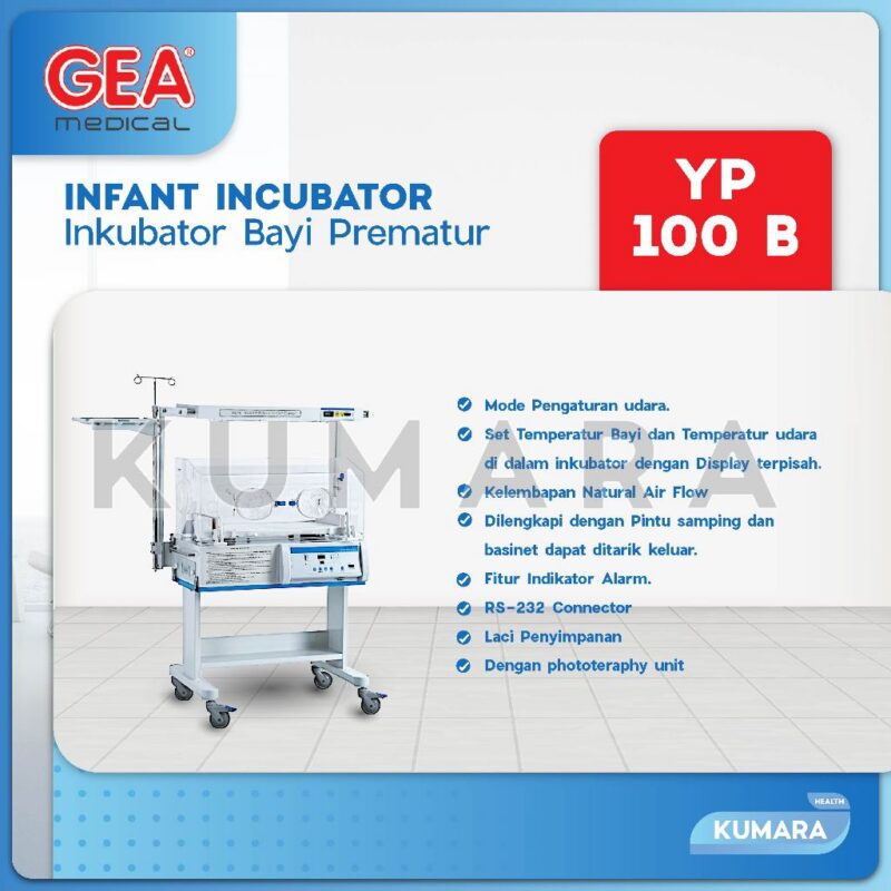 Inkobator bayi YP 100 B adalah sebuah tempat tertutup yang suhu lingkungannya dapat diatur pada suhu tertentu sesuai kebutuhan untuk menghangatkan bayi. inkubator ini biasa digunakan untuk bayi yang prematur atau bayi yang membutuhkan perawatan khusus. inkubator bayi YP 100 B juga diberi tambahan lampu phototeraphy.