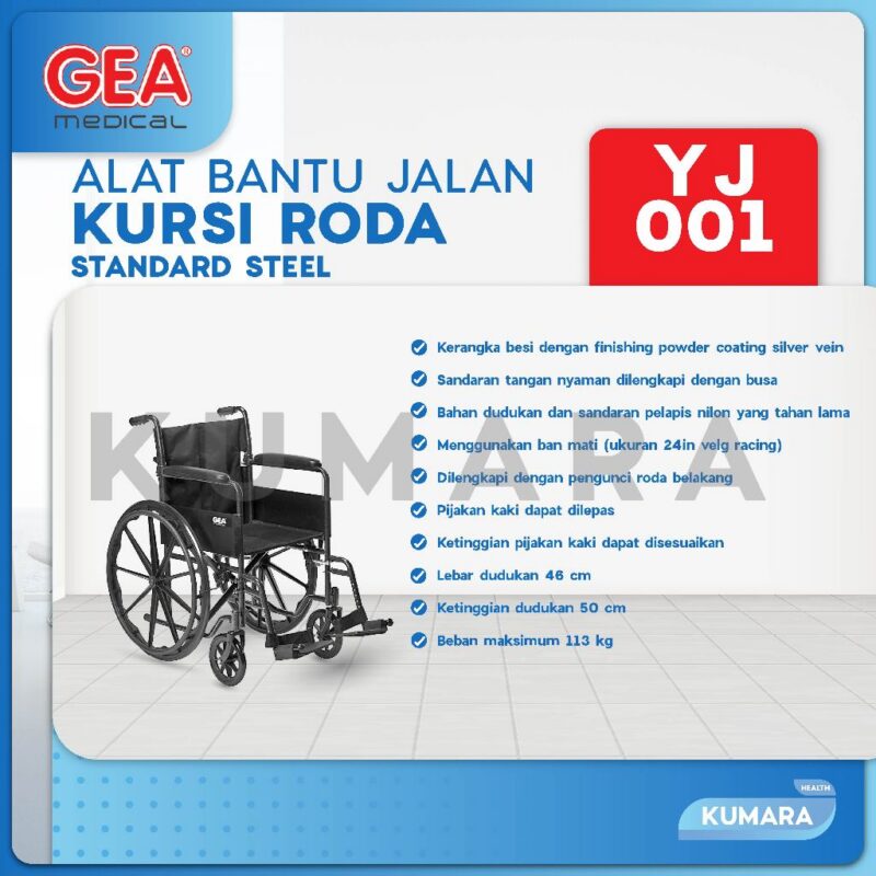 Kursi Roda GEA YJ-001 merupakan kursi roda manual dengan kerangka besi dengan finishing powder coating yang mampu menopang beban hingga 113 kg, dengan lebar dudukan berkisar 45cm kursi ini cocok digunakan pasien dewasa maupun lansia.