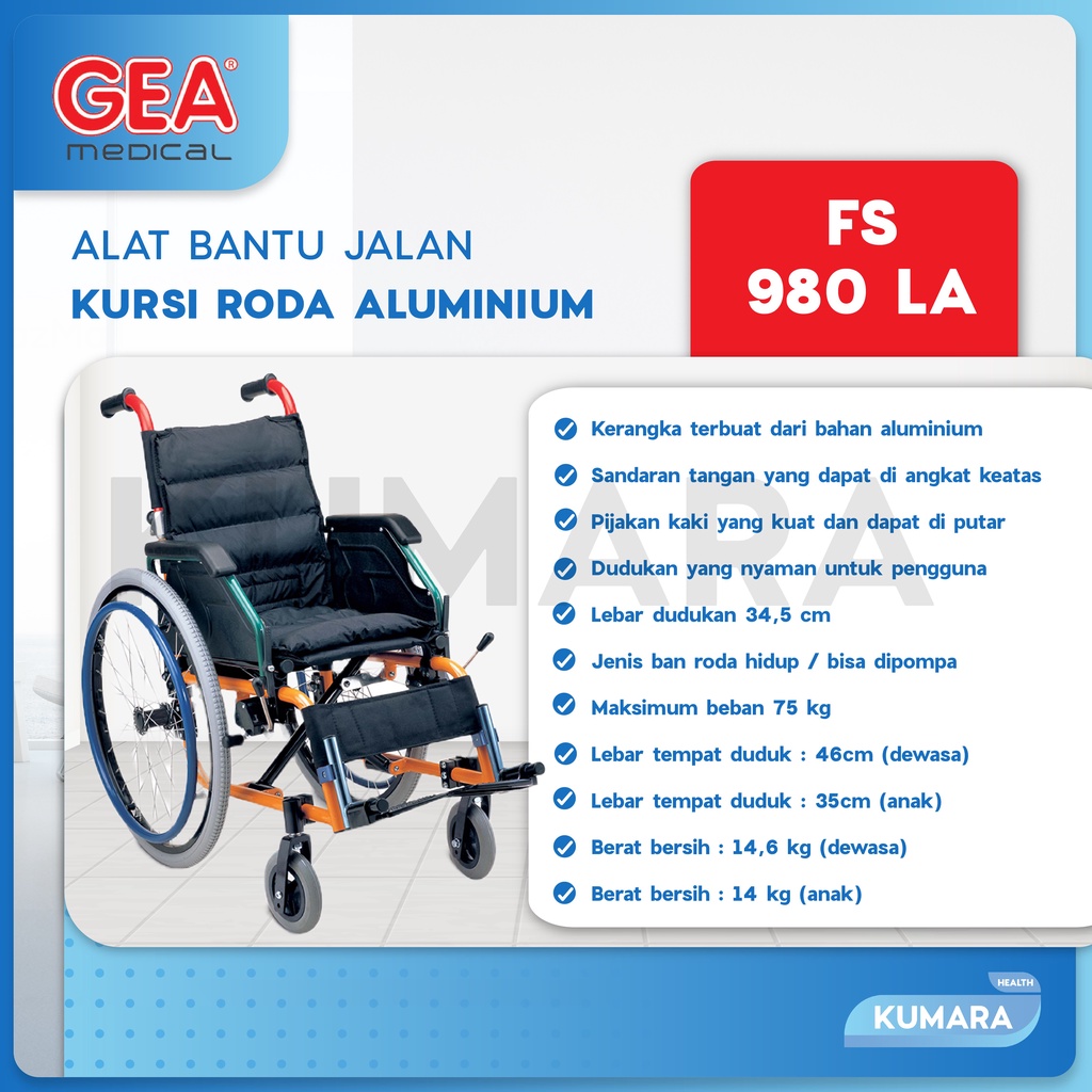 GEA – Kursi Roda Travel Portable Aluminium / Wheelchair FS 980 LA Alat bantu yang digunakan oleh orang yang mengalami kesulitan berjalan menggunakan kaki, baik karena sakit, cidera maupun lumpuh. Kerangka terbuat dari aluminium dengan lapisan warna yang menarik dan bergaya, kursi ini dapat digunakan untuk usia anak-anak dengan kapasitas maksimal 75 kg untuk tipe FS 980 LA-35 dan 100kg untuk tipe FS 980 LA-46 Fitur Produk – Kursi roda khusus usia anak dan dewasa – Kerangka terbuat dari bahan aluminium – Sandaran tangan yang dapat di angkat keatas – Pijakan kaki yang kuat dan dapat di putar – Dudukan yang nyaman untuk pengguna – Jenis ban roda hidup / bisa dipompa – Maksimum beban 75 kg untuk tipe FS 980 LA-35 – Maksimum beban 100kg untuk tipe FS 980 LA-46 – Lebar dudukan 35cm untuk tipe FS 980 LA-35 – Lebar dudukan 46cm untuk tipe FS 980 LA-46 Untuk pengajuan komplain wajib menyertakan video unboxing paket. Semua produk yang telah dibeli tidak dapat di retur, karena resiko kemasan rusak akibat kesalahan kurir pada saat pengiriman paket. Pastikan produk yang dipesan sudah benar dan sesuai pada saat transaksi. Happy Shopping Sahabat Sehat Keluarga !!