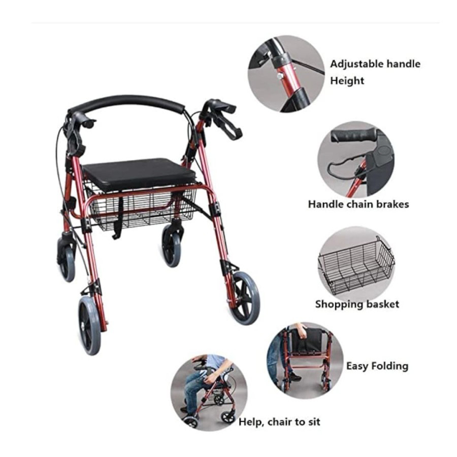 – Pegangannya dapat diatur ketinggian, rollator bisa dilipat dan memiliki keranjang yang bisa dipakai saat ingin meletakan barang sesuatu.