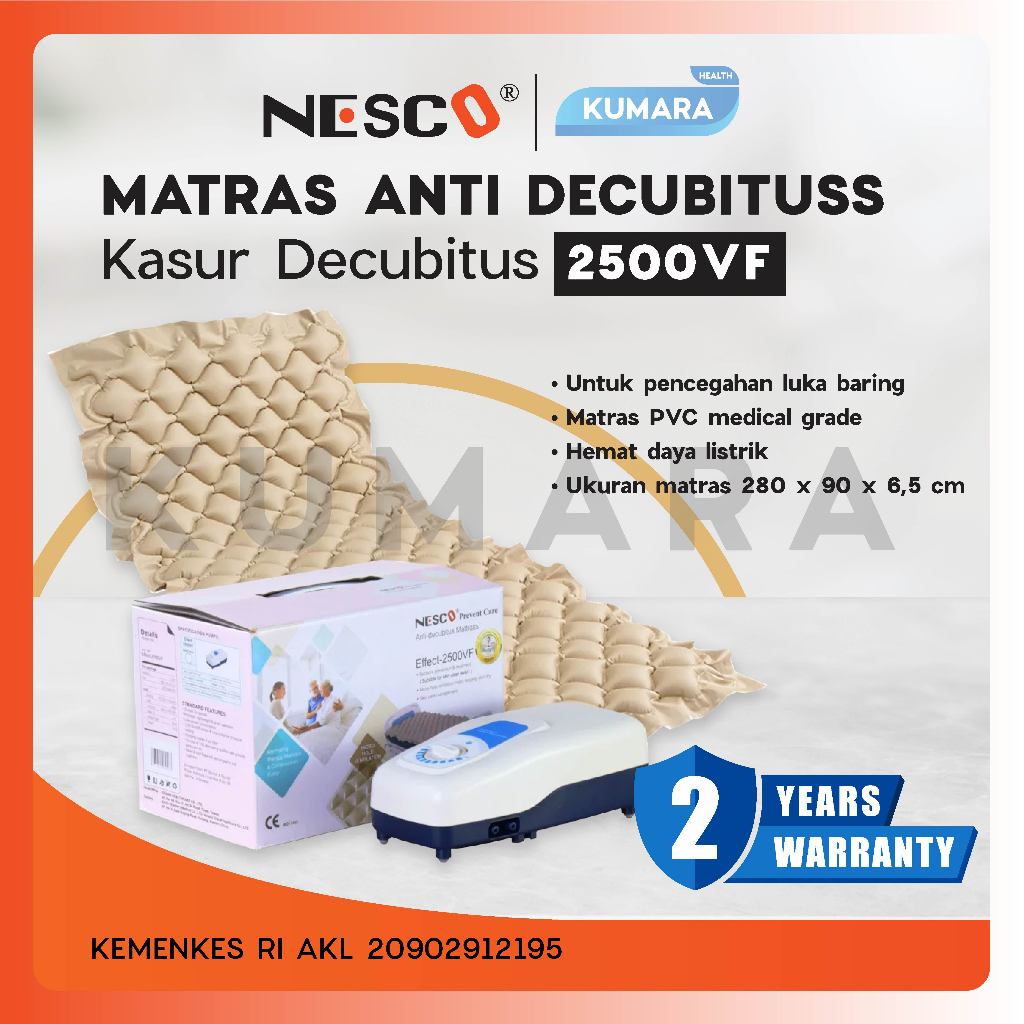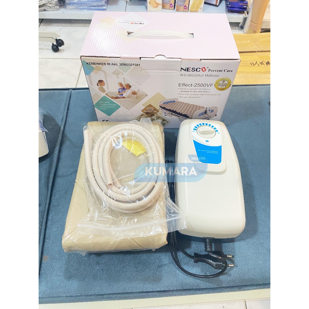 Nesco Effect-2500VF merupakan kasur anti decubitus bermanfaat untuk membantu mencegah terjadinya borok atau luka di bagian tubuh pasien yang berbaring lama dan tidak pernah digerakan. Biasanya bagi pasien stroke, koma dan lain-lain. Kasur anti decubitus ini dilengkapi dengan mesin pompa udara listrik bertenaga kecil untuk memompa aliran udara keluar-masuk secara otomatis. kasur ini berbentuk gelombang-gelombang berisi tekanan udara yang memompa naik-turun menyesuaikan bidang tubuh, berat maupun posisi pasien yang berbaring diatasnya.