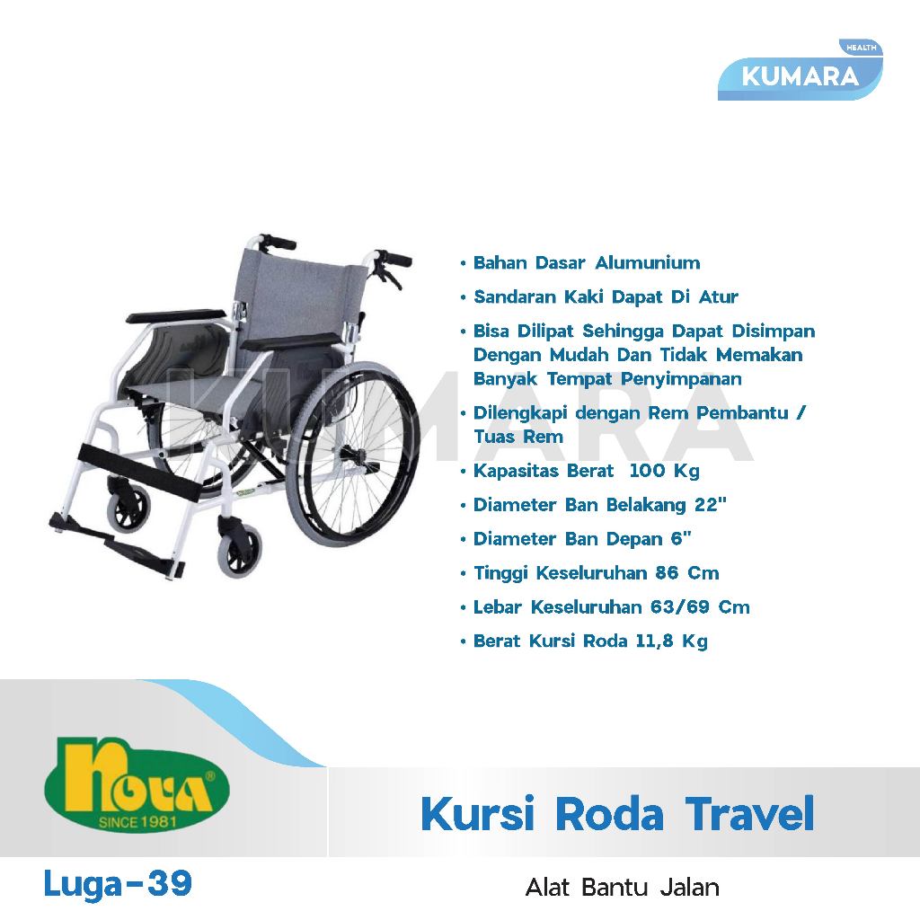 Kursi Roda Travel Nova LUGA Merupakan Kursi Roda dengan Bahan Aluminium Dan memiliki 2 Tipe Ban yang Berbeda Ukuran Yaitu Luga 39, Sandaran Kaki dapat di atur sehingga membuat pengguna lebih nyaman untuk duduk. Pijakan kaki dapat di atur. Kursi dapat disimpan dengan mudah.