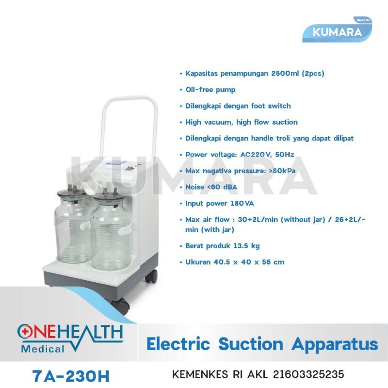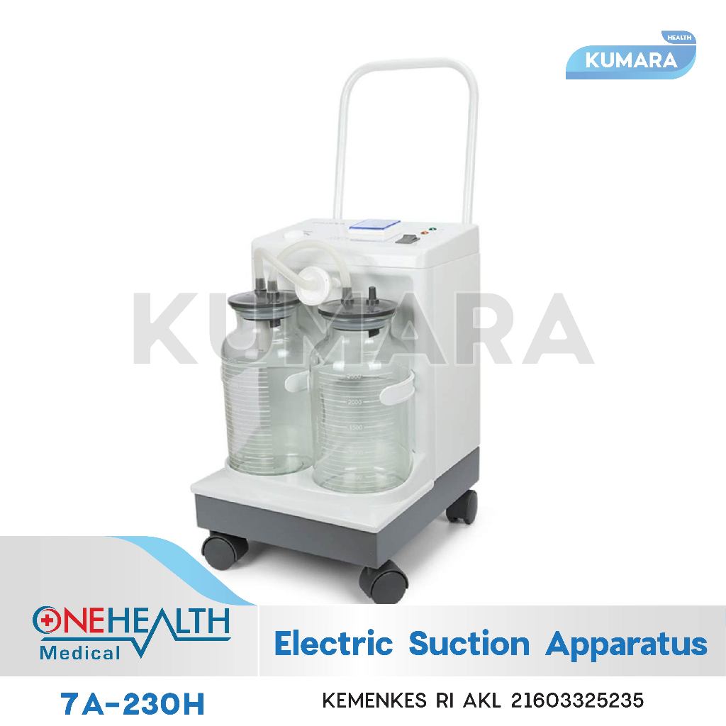 Suction pump merupakan peralatan medis yang berfungsi untuk menghisap cairan yang tidak dibutuhkan oleh tubuh pada proses operasi, seperti darah, isi lambung, dan sebagainya. Suction pump OneHealth 7A-230H dilengkapi dengan dua tabung untuk penampungan cairan dengan daya hisap 80kPa. Alat ini dilengkapi dengan troli sehingga lebih mudah digeser atau di pindah tempatkan.