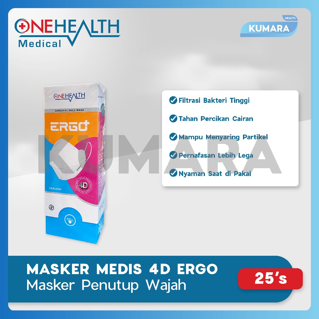 Masker Medis Onehealth ERGO+ 4D (Desain Masker Lebih Luas & Lega Saat Bernafas), 4ply, Earloop ini merupakan masker medis yang dilengkapi dengan bahan non woven dan bahan filter antibakteri yang didesain dengan bentuk yang disempurnakan sehingga dapat mengoptimalkan fungsi dan manfaatnya melindungi dari cairan, bakteri, kuman dan partikel mikro lainnya.