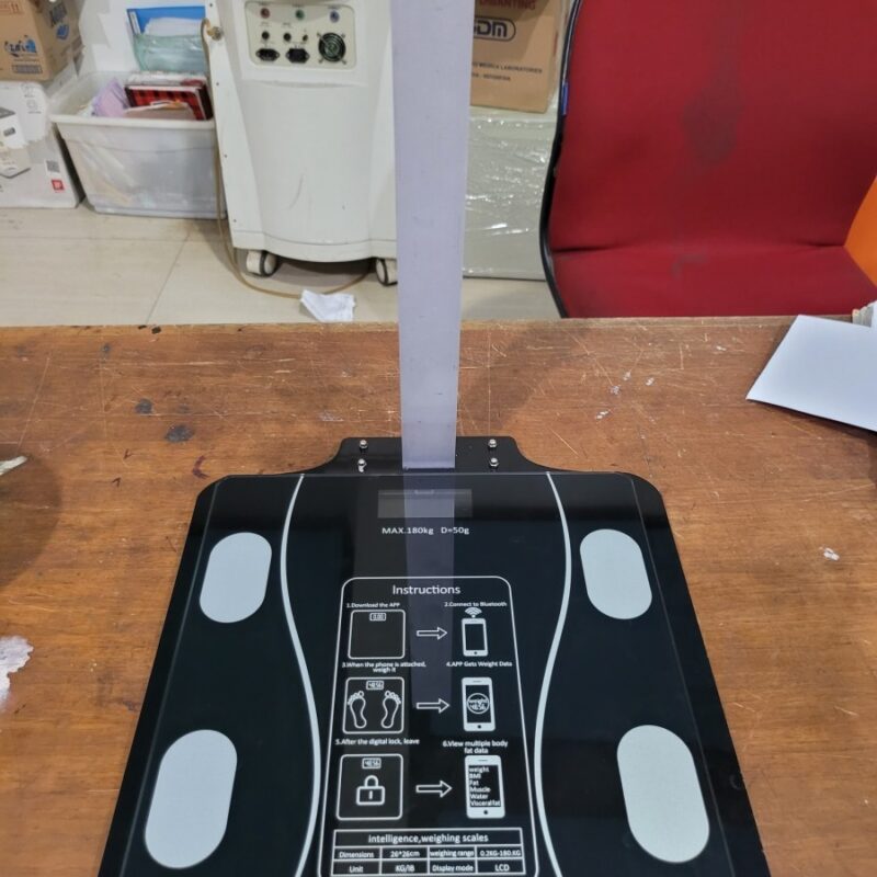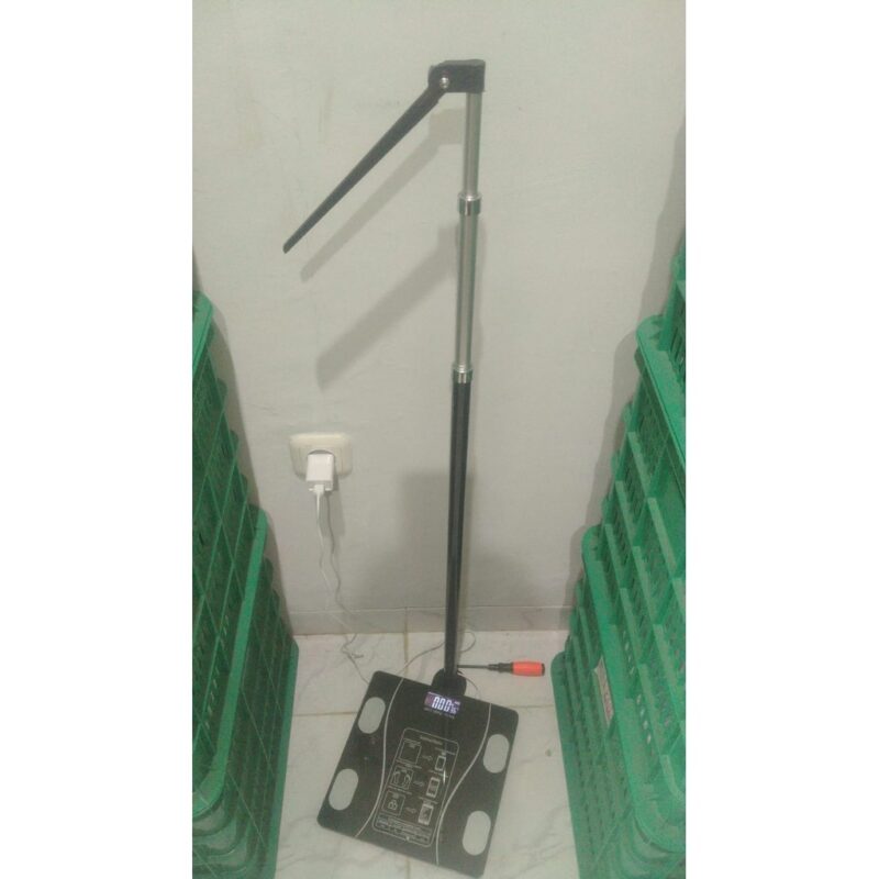 Stadiometer + tercanggih timbangan badan Onehealth. Pada bagian pijakan juga dialasi oleh plat aluminium. Dilengkapi fitur koneksi Bluetooth yang memungkinkan analis BMI bisa dilakukan di HP dengan mudah.