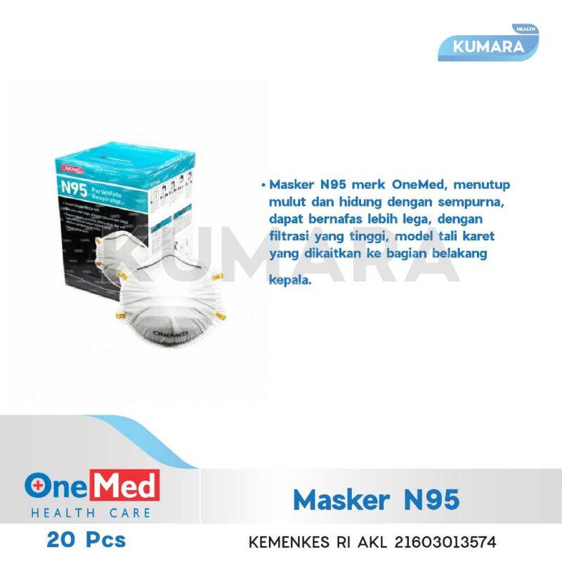 Masker N95 merk OneMed, menutup mulut dan hidung dengan sempurna, dapat bernafas lebih lega, dengan filtrasi yang tinggi, model tali karet yang dikaitkan ke bagian belakang kepala.
