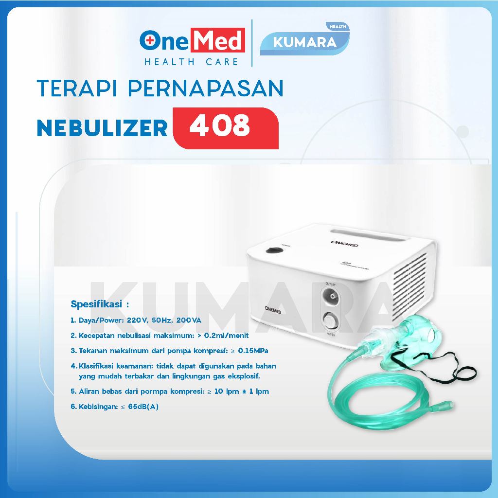 ONEMED – Nebulizer 408 / Air Compressing Nebulizer Spesifikasi : 1. Daya/Power: 220V, 50Hz, 200VA 2. Kecepatan nebulisasi maksimum: > 0.2ml/menit 3. Tekanan maksimum dari pompa kompresi: ≥ 0.15MPa 4. Klasifikasi keamanan: tidak dapat digunakan pada bahan yang mudah terbakar dan lingkungan gas eksplosif. 5. Aliran bebas dari pormpa kompresi: ≥ 10 lpm ± 1 lpm 6. Kebisingan: ≤ 65dB(A) Asesoris Kuantitas : – Unit Utama 1 unit – Nebulizer Kit 1 set (air tube, nebulizer bottle, masker dewasa, masker anak) – Kabel Power 1 pcs – Air Filter 2 pcs – Buku Panduan 1 pcs – Kartu Garansi 1 pcs Untuk pengajuan komplain wajib menyertakan video unboxing paket. Semua produk yang telah dibeli tidak dapat di retur, karena resiko kemasan rusak akibat kesalahan kurir pada saat pengiriman paket. Pastikan produk yang dipesan sudah benar dan sesuai pada saat transaksi. Happy Shopping Sahabat Sehat Keluarga !!