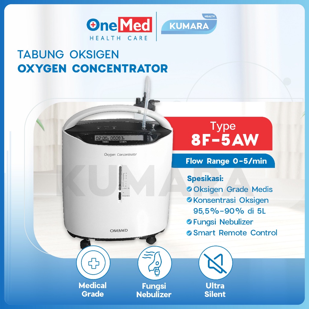 Oxygen Concentrator type 8F-5AW 5L merk OneMed, alat pengubah udara di sekitar menjadi oksigen yang siap hirup, dilengkapi roda. Dilengkapi dengan botol humidifier, selang oksigen, nasal canula, jet nebulizer, dan filter udara.