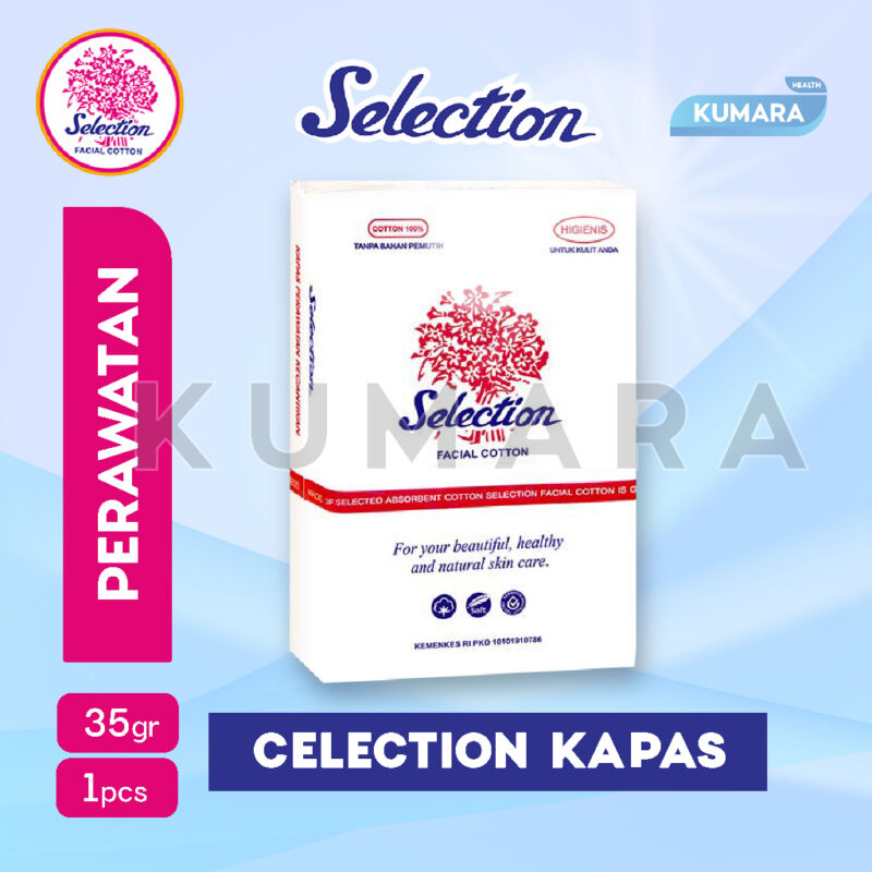 Kapas merupakan serat halus dari tanaman kapas yang biasanya berasal dari daerah tropika dan subtropika. Serat ini kemudian dipintal menjadi bentuk kapas yang Anda tahu. Kapas biasanya digunakan untuk membersihkan wajah, memakai toner, menyembuhkan luka, dan lainnya. Banyak sekali jenis kapas sesuai dengan fungsi dan kebutuhan Anda. Salah satu kapas yang bisa Anda gunakan adalah Selection Kapas, yang merupakan sebuah kapas kecantikan yang lembut serta halus, dapat digunakan sebagai puff serta tidak mengandung mercury dan bebas dari chlorine, bersih dan hygienis untuk membersihkan make up sehingga aman dan lembut untuk bayi. Terdapat dua pilihan yaitu Selection Kapas, Selection Special Kapas Lapis Tipis, dan Selection Round Facial Cotton.