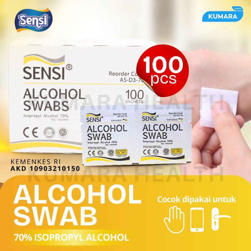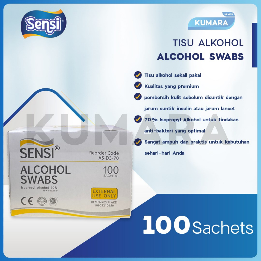 – Alcohol swabs merk SENSI adalah antiseptik dengan bahan dasar seperti tisu basah berukuran 3 x 3cm yang mengandung alkohol.