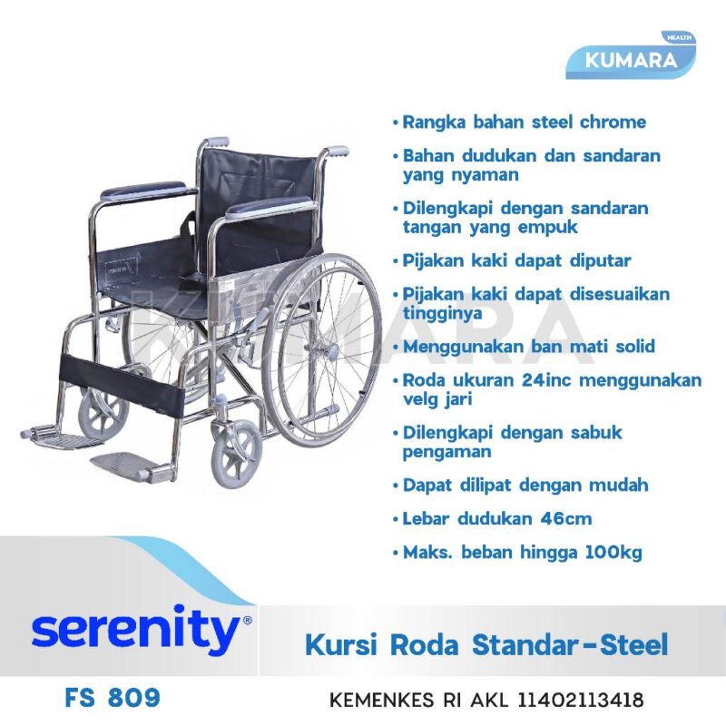 Kursi roda standar rumah sakit dari Serenity FS809 dengan kerangka steel chrome untuk ketahanan yang kuat mampu menopang beban hingga 100kg. Kursi roda ini dilengkapi dengan roda roda belakang besar (24 inch) dengan velg jari-jari. Kursi roda ini memudahkan pengguna untuk mendorong secara mandiri. Dengan bahan dudukan dan sandaran yang nyaman menggunakan kulit oscar/sintetis sehingga dapat dibersihkan dengan mudah.