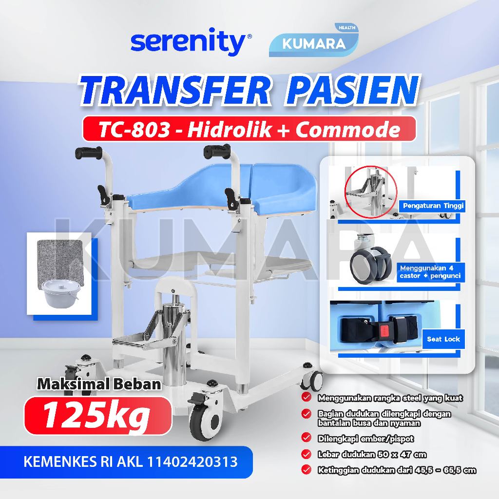 Kursi roda transfer pasien Serenity TC-803 merupakan alat bantu jalan untuk memfasilitasi pemindahan pasien seperti ke toilet, kamar tidur, ruang tamu, taman dan lain-lain. Alat ini dilengkapi pedal pengatur ketinggian kursi dengan sistem hidrolik sehingga lebih mudah. Kursi ini mudah dioperasikan, bisa di buka dan tutup, handle pendorong dapat dilipat memudahkan dalam penyimpanan. Menggunakan rangka besi yang kokoh dapat menahan beban hingga 125kg.