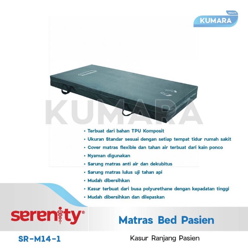 Serenity Hospital Bed Mattress SR-M14-1 adalah Matras untuk melengkapi Ranjang pasien series seperti Manual Bed Double Crank SR B02C, Manual Bed Three Crank SR B03C, dan ranjang pasien lainnya. Fitur Produk • Terbuat dari bahan TPU Komposit • Ukuran Standar sesuai dengan setiap tempat tidur rumah sakit • Cover matras flexible dan tahan air terbuat dari kain ponco • Nyaman digunakan • Sarung matras anti air dan dekubitus • Sarung matras lulus uji tahan api • Mudah dibersihkan • Kasur terbuat dari busa polyurethane dengan kepadatan tinggi • Mudah dibersihkan dan dilepaskan • Warna: Hijau Tua Spesifikasi SPESIFIKASI PRODUK Jenis Produk Matras Ranjang rumah sakit Bahan Sarung Matras TPU High Density Ya Matras Lentur Ya Dilipat menjadi beberapa bagian ya Dapat digunakan pada ranjang 1 crank / 2 crank / 3 crank Anti decubitus Ya Bahan Matras Lateks sintetis laminasi rebonded Ketahanan Matras 5 Tahun Ketebalan Matras 10 cm Dimensi Keseluruhan (PxLxT) 196 x 85 × 10 cm Dimensi Packing (PxLxT) 68 × 87 × 36 cm Berat Produk 15 Kg