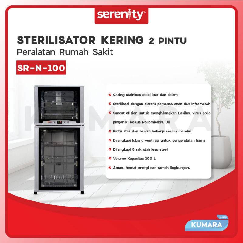 Sterilisator Kering Serenity SR-N-100 merupakan Sterilisator kering 2 pintu dengan metode sterilisasi yang berbeda pada tiap ruangnya dan dapat dioperasikan secara terpisah.