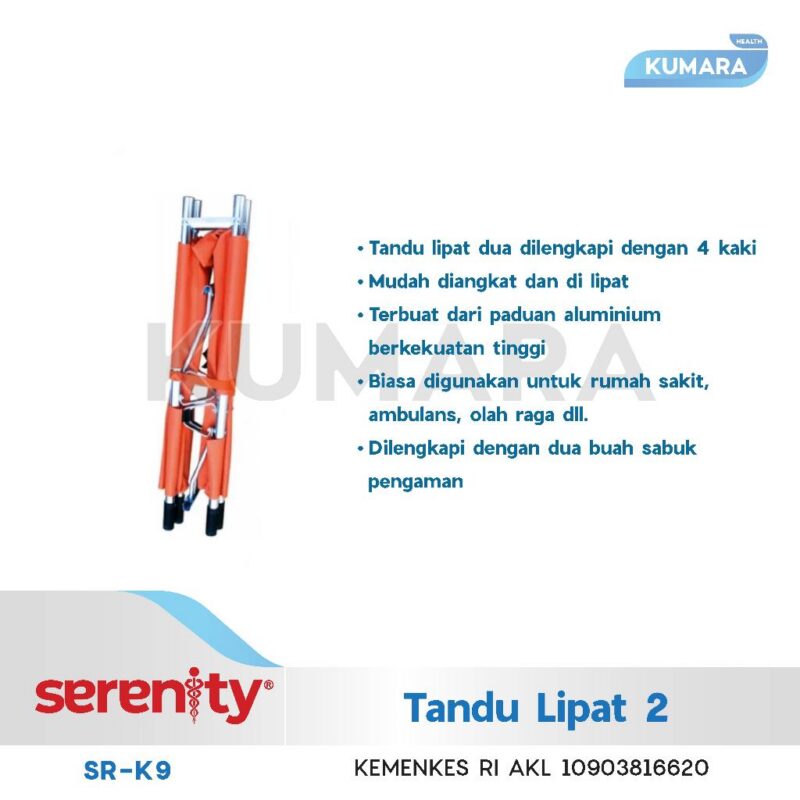 Tandu lipat Dua Serenity SR-FS1F1 merupakan alat yang digunakan untuk mengevakuasi korban dari tempat kejadian ke lingkungan tempat lain yang aman untuk mendapatkan pertoongan medis lebih lanjut. Tandu ini sangat praktis karena cara menyimpannya hanya dengan di lipat. Terbuat dari bahan alumunium dan kain yang berkualitas. Tandu Lipat 2 ini mudah untuk dibawa, namun memiliki kekuatan tinggi dan dapat menahan berat maksimal 159 Kg.