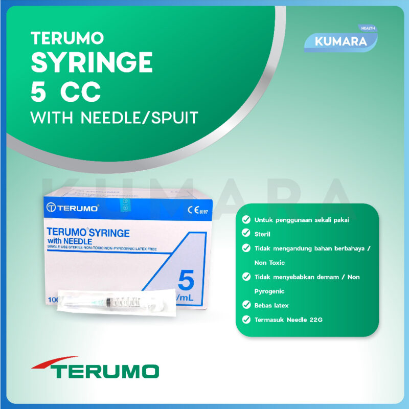 Terumo Syringe with Needle ukuran 5 cc/ml merupakan alat suntik atau spuit yang sudah dilengkapi dengan jarum untuk menyuntikkan cairan.